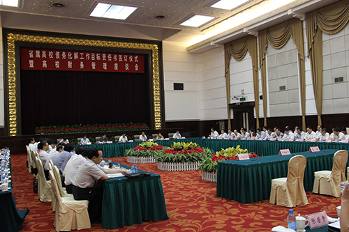 7月29日下午,省属高校债务化解工作目标责任书签订仪式暨高校财务管理座谈会在郑州黄河迎宾馆举行。省政府、省财政厅、教育厅等领导以及省属高校学校领导和财务负责人出席会议。我校党委书记王少安、副校长张战营在财务处负责同志的陪同下应邀参加了会议。