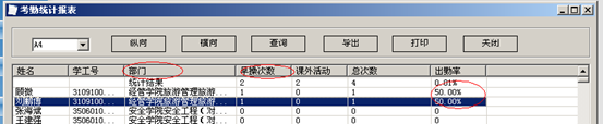 4、考勤管理---考勤统计报表(可以查询本院系在刷卡时间段内的,有效刷卡次数和出勤率。此报表汇总了所在院系所有人员已出勤的和未出勤的统计结果。点击部门和早操次数等可以进行排序)