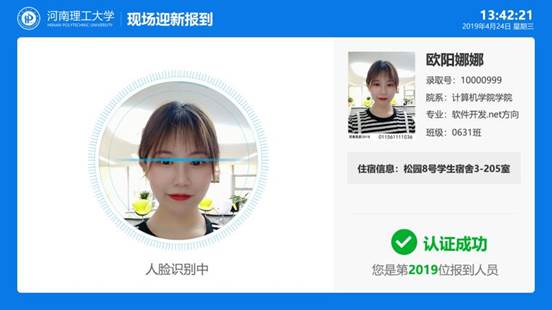 “迎新系统”对接“人脸识别系统”,新生刷脸报到成功后,数据自动上传到迎新大数据平台,实时更新并显示在迎新数据大屏。