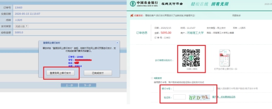 3、点击图3中的“是”,进入图4界面,选择“中国农业银行”支付方式,点击“下一步”,进入图5界面,点击“登录到网上银行支付”,可选择进行扫码支付或K码支付。
