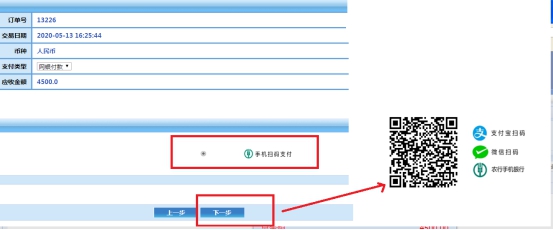 4、点击图3中的“是”,进入图6界面,选择“手机扫码支付”,点击“下一步”,进入图7界面,可通过支付宝、微信、农行手机银行扫码支付。