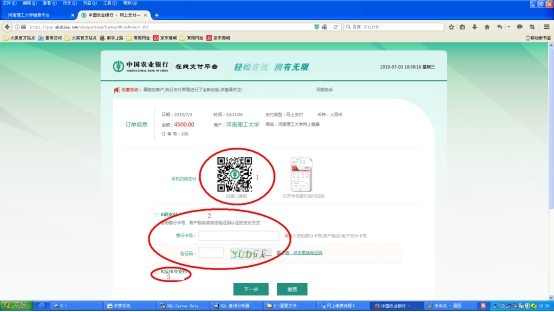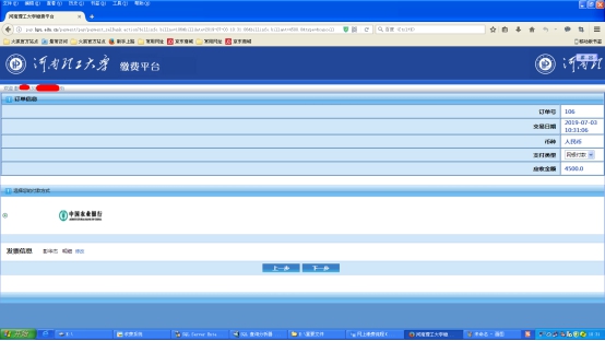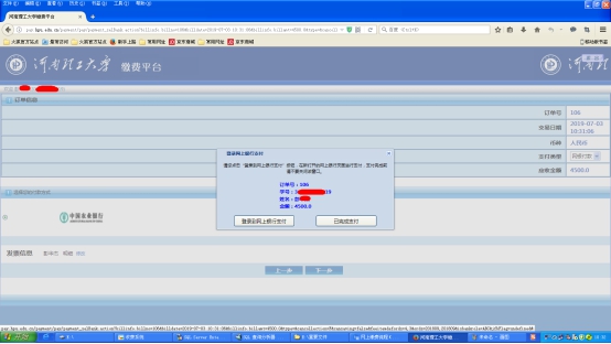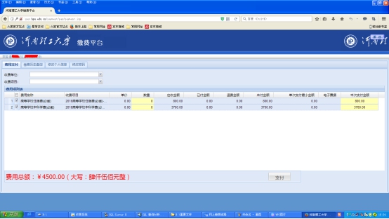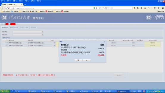 注:a、选择要缴费的费用项,点击“支付”按钮,进入下图(3)的界面。选择一项费用必须全额支付。