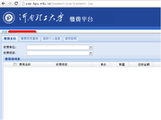 1、输入网上缴费网址http://pay.hpu.edu.cn/payment/,进入下图(1)界面