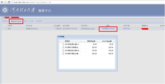 8、点击“缴费历史查询”可以查询到相关缴费信息,在应缴费清单下会列出您所生成的订单信息及其费用项情况。点击“订单明细”进入图(9),可以查询所交过的费用项目。