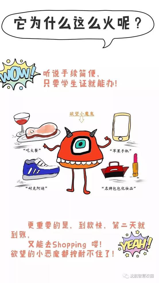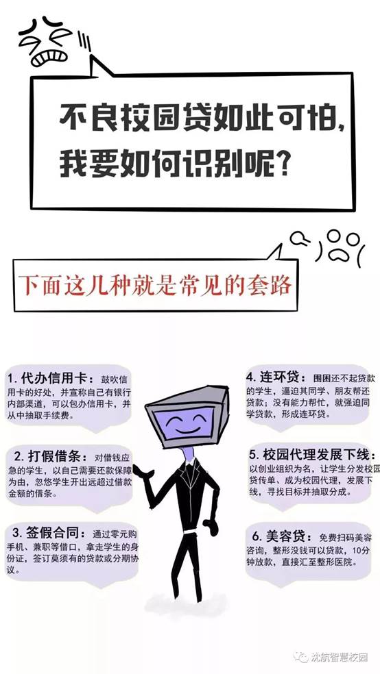 一些校园贷利用虚假广告利诱大学生注册、贷款,文案上写着帮助解决学生在校学习上基本学习和生活的困难,实际上这样的高利贷、诱导贷款、提高授信额度易导致学生陷入“连环贷”陷阱。
